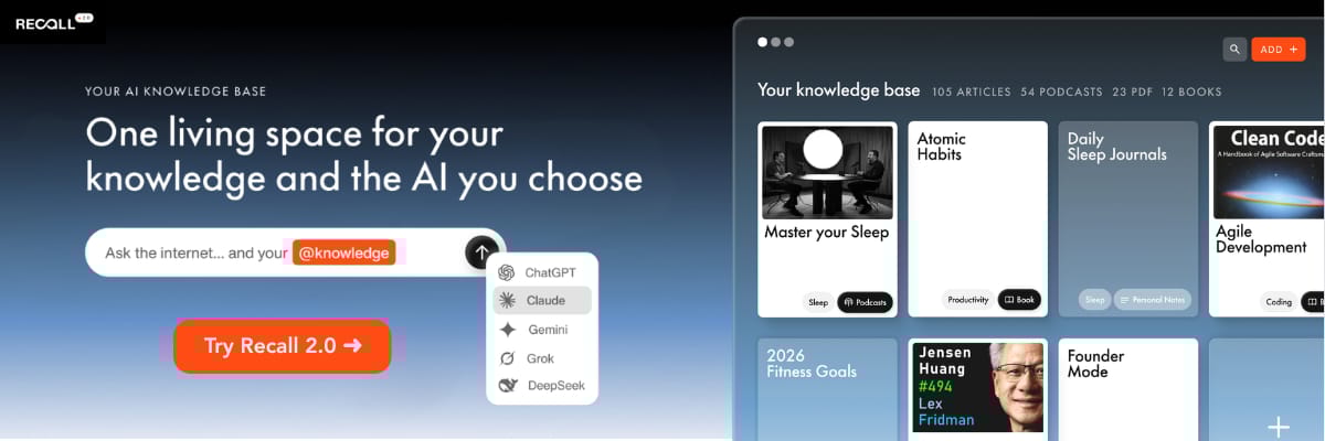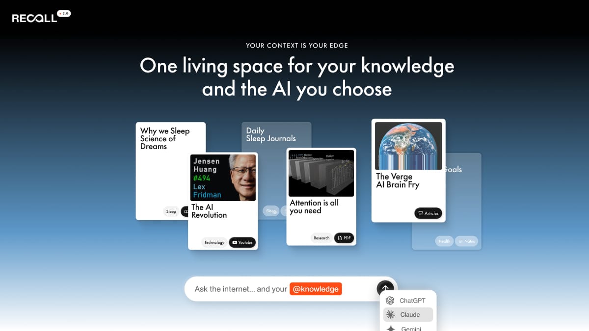 | Today’s Sponsor | Recall 2.0 – Your Knowledge-Grounded AI | | AI leveled the playing field. Everyone has the same models, the same capabilities. The real advantage now comes from what those models are grounded in: your knowledge, your context. | But right now, all of it is trapped across disconnected apps, buried in bookmarks, and lost in chat histories. Recall 2.0 closes the gap. | Save what matters, pick your model, and ask questions no other AI can answer. Condense months of research and personal notes into a single summary. Find the exact moment something was mentioned in a saved podcast. Enrich your existing notes with new studies published this year.