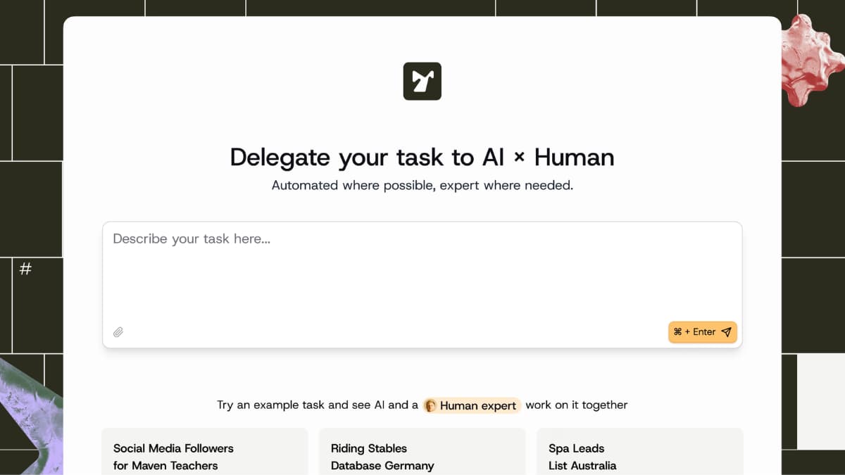| Todayās Spotlight | | Youāve got AI agents, automations, maybe a freelancer or two, and youāre still the one finishing the work. | AI drafts fast and breaks faster. Freelancers deliver after you project-manage the whole thing. Neither actually finishes the job. | Tendem does. Hand off the lead enrichment, the CRM cleanup, the competitor research; whateverās on your plate. Get back a result thatās actually done. Verified, formatted, and ready to use. | Behind the scenes, AI handles the bulk. Domain experts close the last mile. You never prompt, manage, or review. | Describe the task. Get it back done 𦾠| |