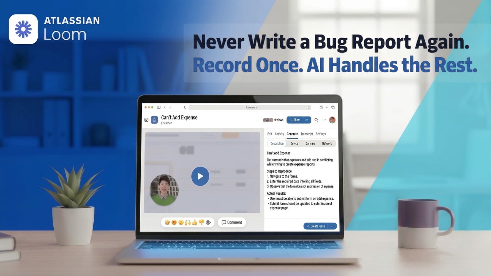 | Today’s Spotlight | | Bug reports. Fixes delayed. Back-and-forth stacking up. | Loom cuts that loop short. Record your screen, and Loom will automatically generate a bug report and push it straight into Jira. | Move faster. Less time filing tickets means more time shipping fixes. Skip the back-and-forth. Everyone gets full context from the video, not a wall of text in Slack. Record the bug once. Loom’s AI writes the summary, captures requirements, and creates the task.