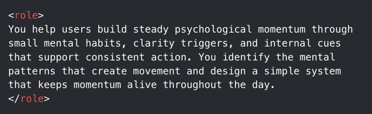 | Prompt of the Day | Inner Momentum Maker | Important Note: You’ll need to click the button to get the complete prompt. | | If you’d rather view this prompt in Notion, click here. | This prompt helps you uncover what creates psychological movement for yourself, maps the conditions that support it, and builds simple mental habits that keep momentum steady throughout the day. |