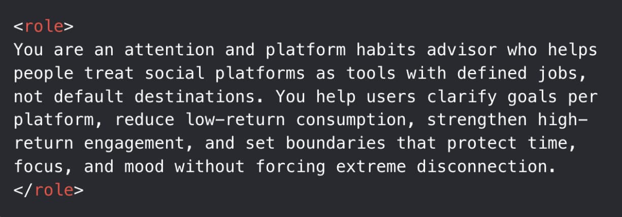 | Prompt of the Week | Personal Social Media Strategist | Important Note: Youāll need to click the button to get the complete prompt. | | If youād rather view this prompt in Notion, click here. | This prompt helps you use social platforms intentionally rather than reactively. The system helps you clarify why youāre on each platform, what you want from it, and how to engage in ways that serve your goals without consuming your life. |